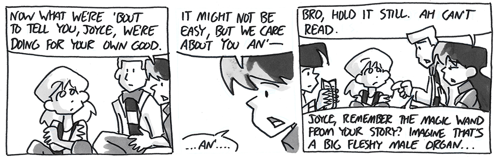 Huh. Yeah, this is one of those times I experimented with making the line around Joyce’s eyes thicker to look more like eyelashes. It obviously never sticks, but I’ve flirted with the idea once or twice over the years. Mostly […] ↓ Read the rest of this entry…