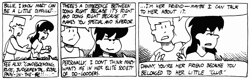 And so Mary’s smile disappears, her judgmental attitude surfaces, and so suddenly we have the Mary you may recognize from Dumbing of Age. Her metamorphosis is complete.