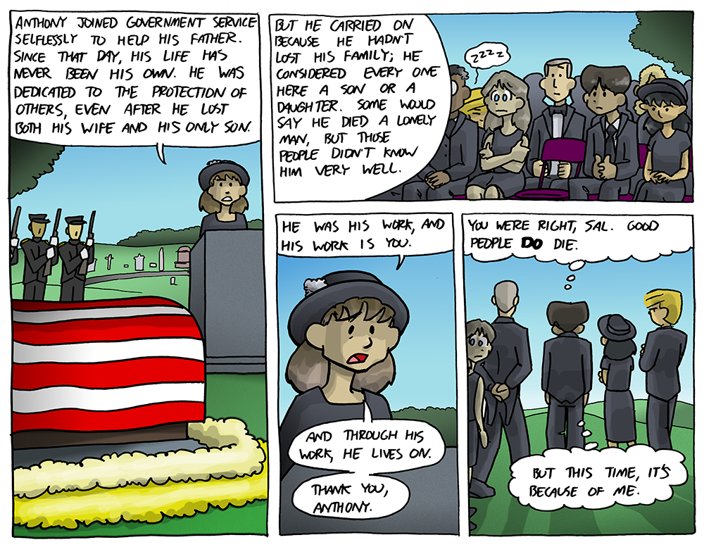 This is my first drawn funeral, right? (my only?) There were some big deaths before this, between Ruth and Tony and Sal’s parents, but I’m pretty sure this is my first funeral. Every time I look at that second panel, […] ↓ Read the rest of this entry…
